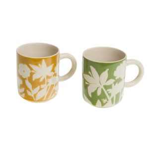Κούπα Billie από πέτρινο σκεύος (πράσινο και κίτρινο). Πρακτικές διαστάσεις (Ø περίπου 8–10 εκ., ύψος 13 εκ.) και γυαλιστερό φινίρισμα για ελκυστική παρουσίαση στο κατάλογο. Ανθεκτική και εύκολη στην αποθήκευση, κατάλληλη για σερβίτσια και πωλήσεις δώρων. Σημαντικό βάρος (3,5 κιλά για το σετ) για αποστολή. Προστιθέμενη αξία: μοντέρνα λουλουδάτα σχέδια και ανθεκτική ποιότητα πέτρινου σκεύους.
