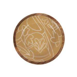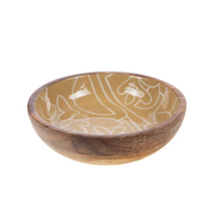 Ξύλινος μπολ από μάνγκο με διάμετρο 22 εκ., με εσωτερικό γυαλισμένο με κεχριμπαρένιο χρώμα και διακοσμητικά σχέδια. Αυτός ο ανθεκτικός και αισθητικά ευχάριστος δοχείο φαγητού ταιριάζει εύκολα σε μια ποικιλία φυσικών και χειροποίητων σερβίτσιων. Ελαφρύ (510 γρ.) και με πρακτικές διαστάσεις.