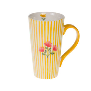 Μεγάλη κούπα από λεπτό πορσελάνινο (Νέα Οστά Κίνας) με διακοσμητικό σχέδιο, παρουσιάζεται σε κουτί δώρου «Louise». Μεγάλο μέγεθος (Υ 15 εκ.) Φινίρισμα με κίτρινη εκτυπωμένη λωρίδα και λουλουδάτο μοτίβο, εργονομική λαβή. Ελαφρύ προϊόν (290 γρ.)