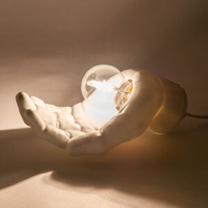 Λευκή διακοσμητική βάση “χέρι” για φωτισμό “MAIN” με υποδοχή για λάμπα στην παλάμη και λευκή πρίζα , κατασκευασμένη από πορσελάνη .