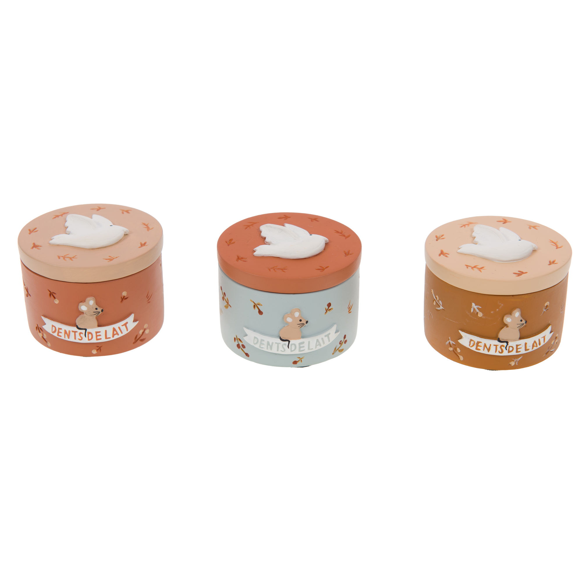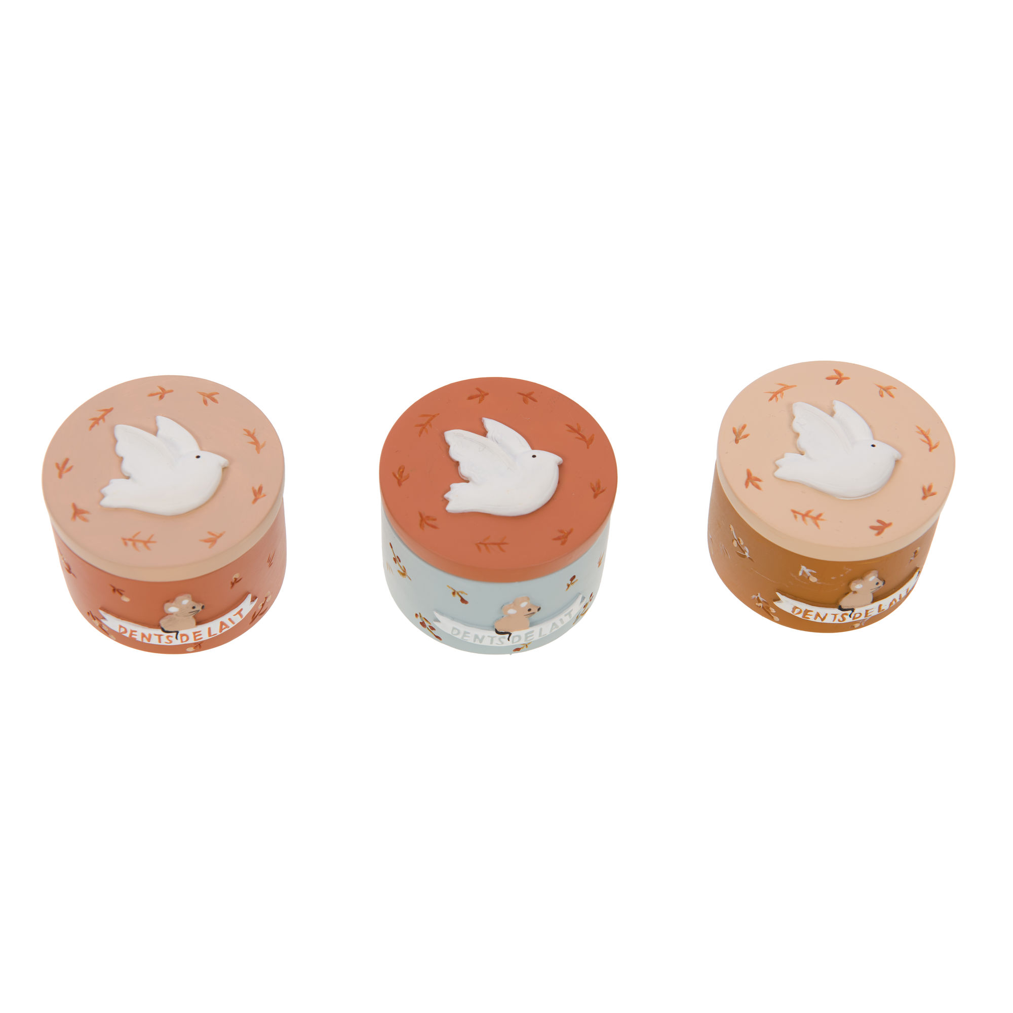 Κουτί για νεογιλά δόντια κατασκευασμένο από ρητίνη, διαθέσιμο σε 3 ταιριαστά χρώματα (τερακότα, παστέλ μπλε, μπεζ). Συμπαγές (5x4x5 εκ.) και ελαφρύ (90 γρ.), χωράει εύκολα σε διάφορα αξεσουάρ παιδιών. Ο απαλός σχεδιασμός του με θέμα πουλί και την επιγραφή «Νεογιλά Δόντια» απευθύνεται σε οικογένειες που αναζητούν ένα πρακτικό και αισθητικό προϊόν για να διατηρήσουν τις αναμνήσεις της παιδικής ηλικίας.