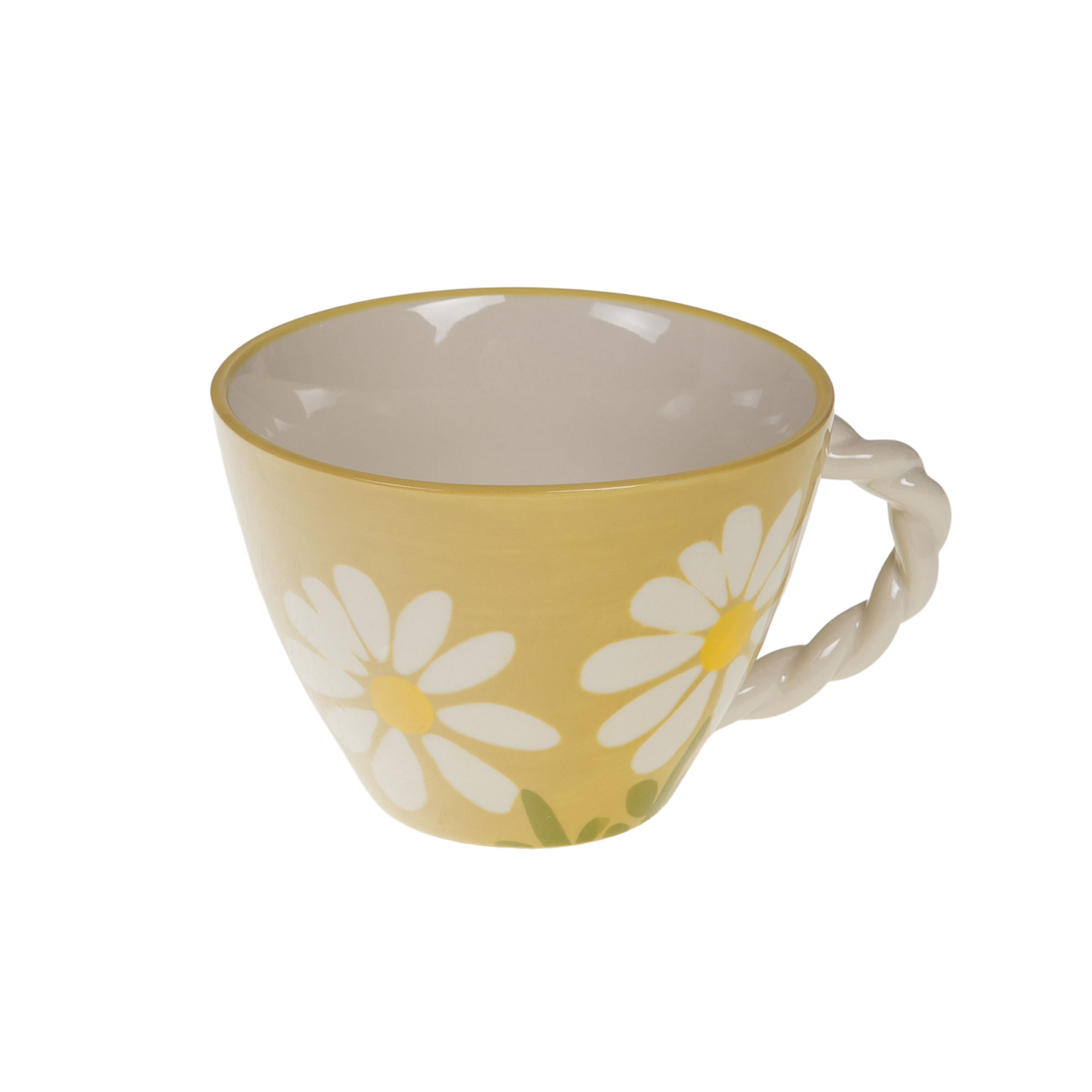Κούπα τσαγιού από πέτρινο σκεύος διακοσμημένη με μοτίβο μαργαρίτας, ιδανική για να αναδείξει μια σειρά πρωινού ή δώρου για το σπίτι. Πρακτικές διαστάσεις (Ø περίπου 11 εκ., Υ 9 εκ.) και ελεγχόμενο βάρος (440 γρ.) διασφαλίζουν σταθερότητα και ευχάριστη αίσθηση στο χέρι. Γυαλιστερό φινίρισμα με στριφτή λευκή λαβή προσφέρει χαρακτηριστική οπτική ταυτότητα. Προϊόν μεμονωμένης μονάδας.