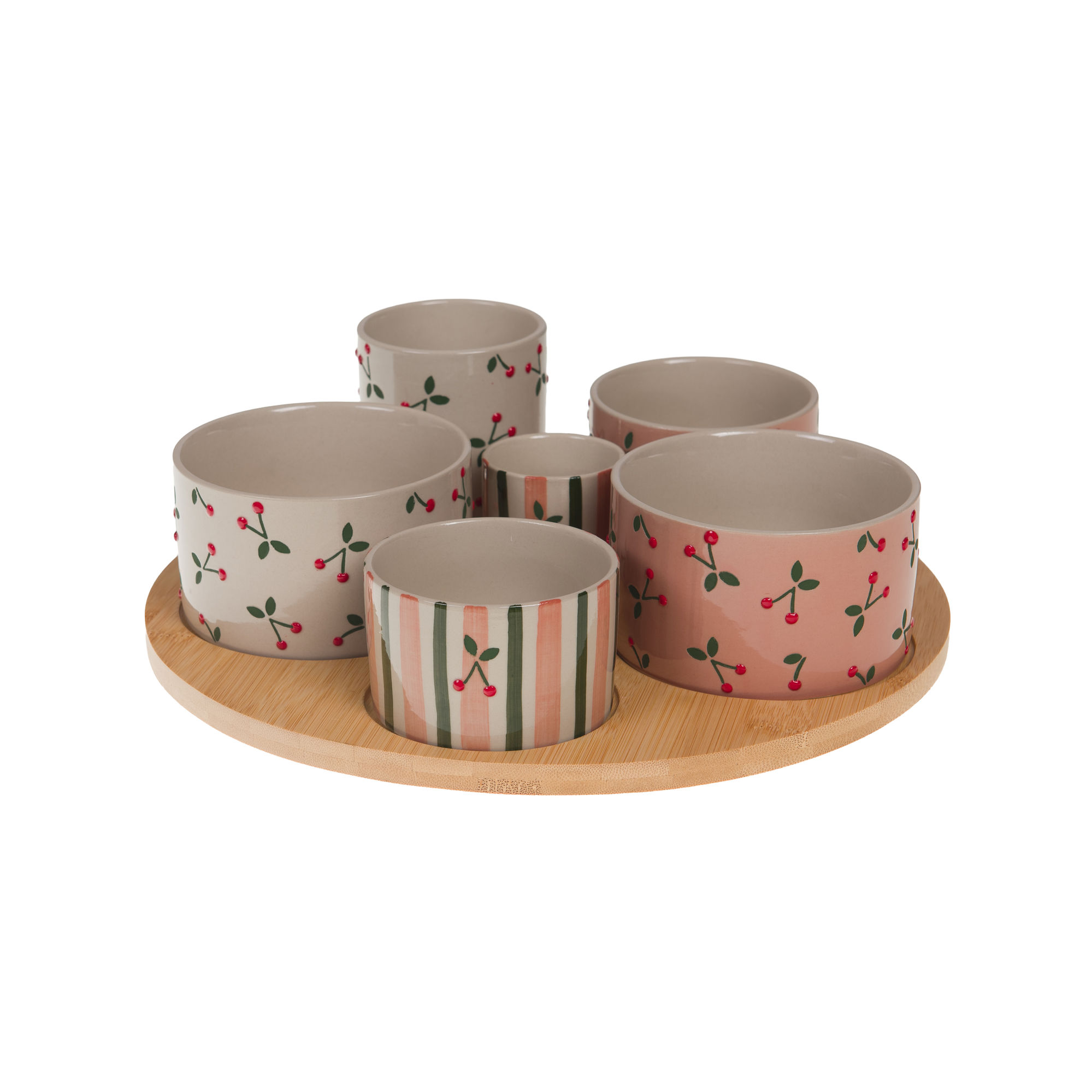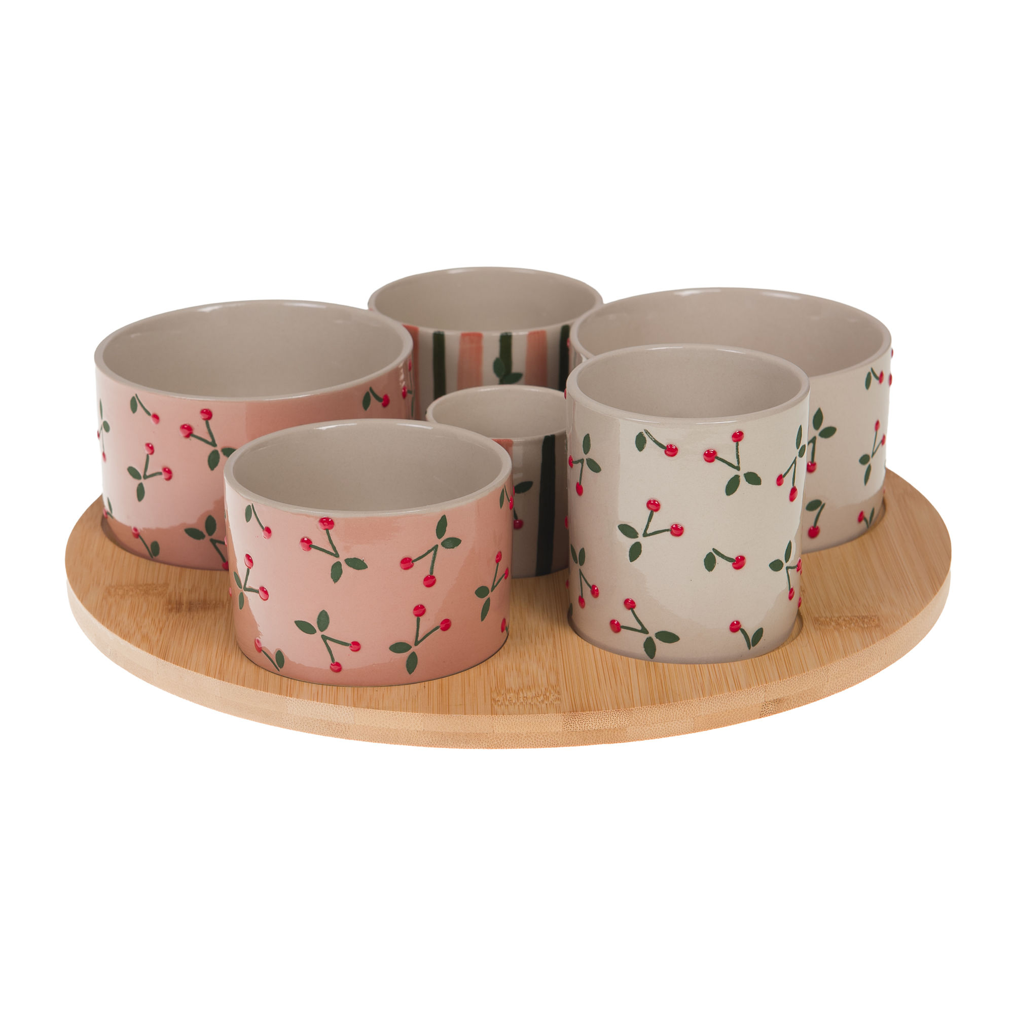 Σετ σερβιρίσματος από πέτρινο κεραμικό με κεντρικό πιάτο και 6 διακοσμητικά μπολ “Griotte”, παρουσιασμένα σε στρογγυλό δίσκο από ανοιχτό ξύλο με μηχανισμό που περιστρέφεται. Ιδανικό για να εμπλουτίσετε μια σειρά από ορεκτικά ή διακοσμητικά σκεύη: συντονισμένα κομμάτια, χειροποίητο φινίρισμα και φιλικός σχεδιασμός. Συμπαγές μέγεθος (διάμετρος δίσκου ≈31 εκ.) Έρχεται σε κουτί δώρου.
